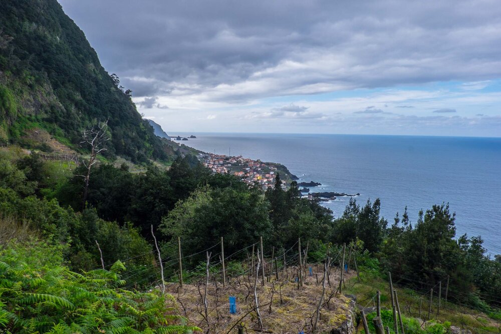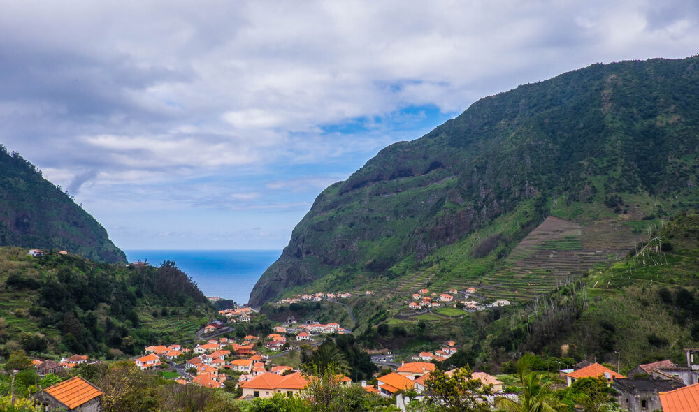 We continue our drive west from São Vicente along the sea under cliffs and terraced vineyards towards Porto Moniz, following the recently completed highway that very nearly circumnavigates the island. The road darts in and out of countless tunnels bored through the steep ridges, running roughly parallel to the old narrow one-lane highway that hangs precariously on the outside of the near-vertical green cliffs.
