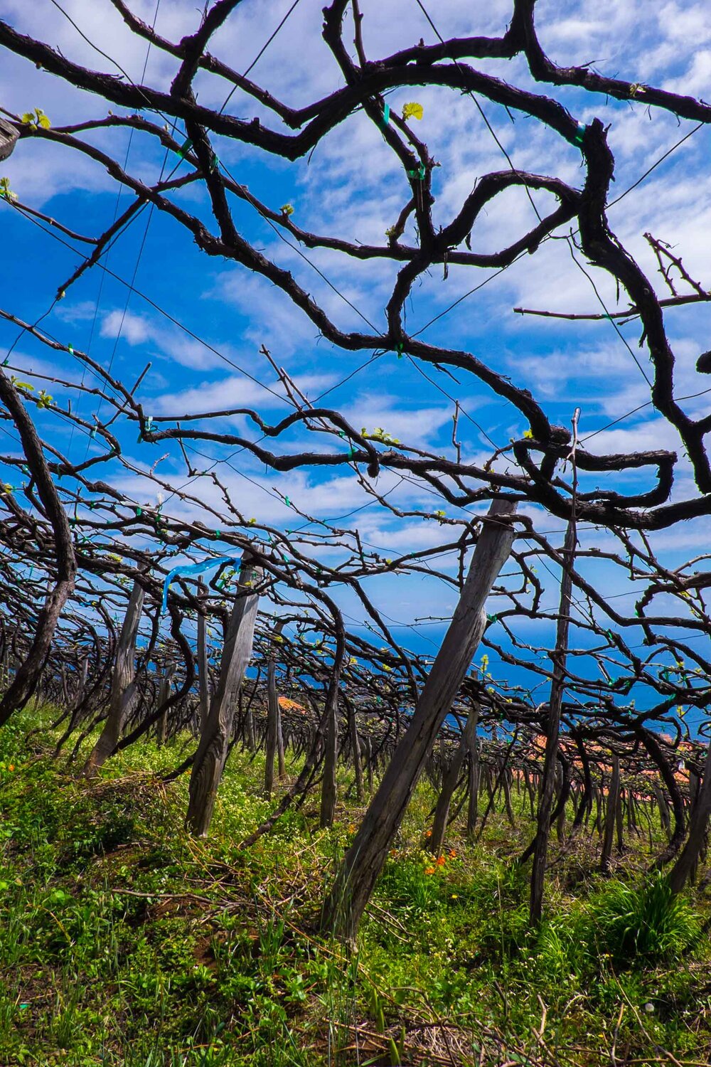 Considering the small allocation of arable land per household, it’s not surprising that locals have adopted a form of vineyard trellising that maximizes land use. Latada, the name given to this traditional pergola-like system, is a lattice of horizontal wires supported by wooden stakes on which vines are trained, creating a roof of shoots and leaves parallel to the ground. The height of the pergola, ranging from about one to two meters, depends on the elevation of the vineyard: the higher up, the lower the pergola to the ground. This helps to regulate ripening, as average temperatures drop as you move up hillsides, and grapes trained closer to the ground benefit from the stored and reflected heat off soil and stones. Vines, mainly of the sercial variety planted at the very highest viable elevations nearing 800 meters, are grown practically on the ground, a system called vinha do chão (literally: “vine of the ground”) to get that critical ripening nudge.